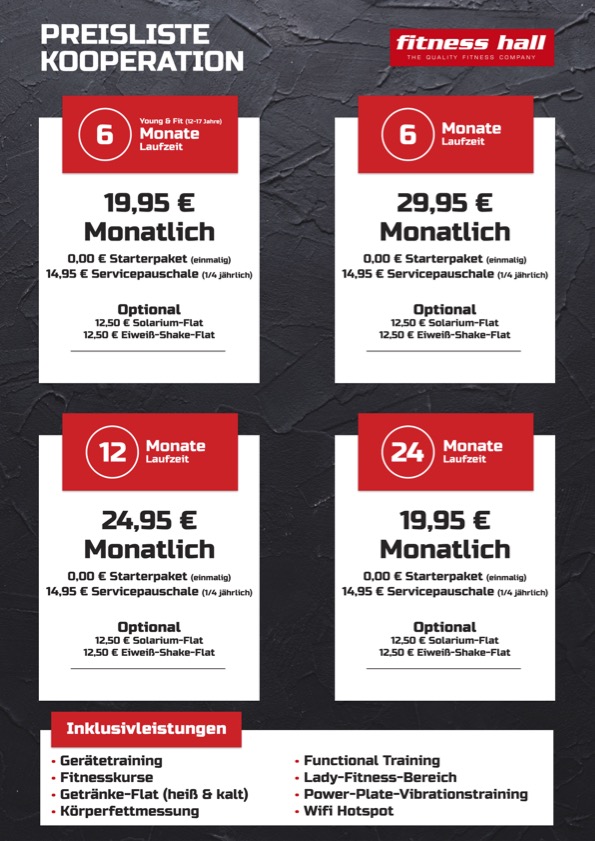 Sponsoring Unsere Mitglieder erhalten einen vergünstigten Mitgliedsbeitrag in der fitness hall Erkelenz. Bei Interesse ist Peter der Anprechpartner.
